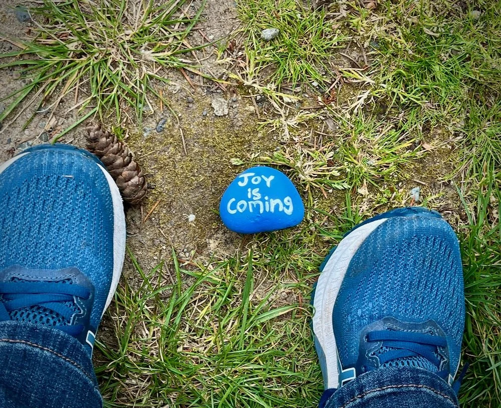 My feet after I bumped into a rock—painted the same bright blue as my shoes (they were on sale, what can I say?!)—left by some kind soul along a path I walk often.
